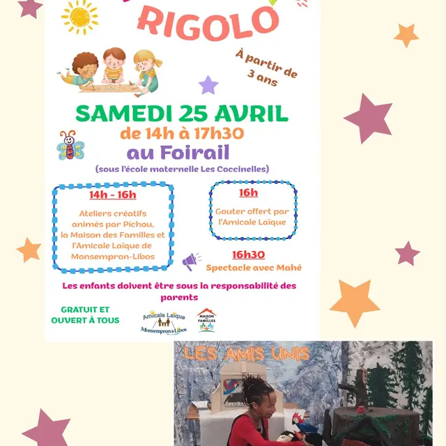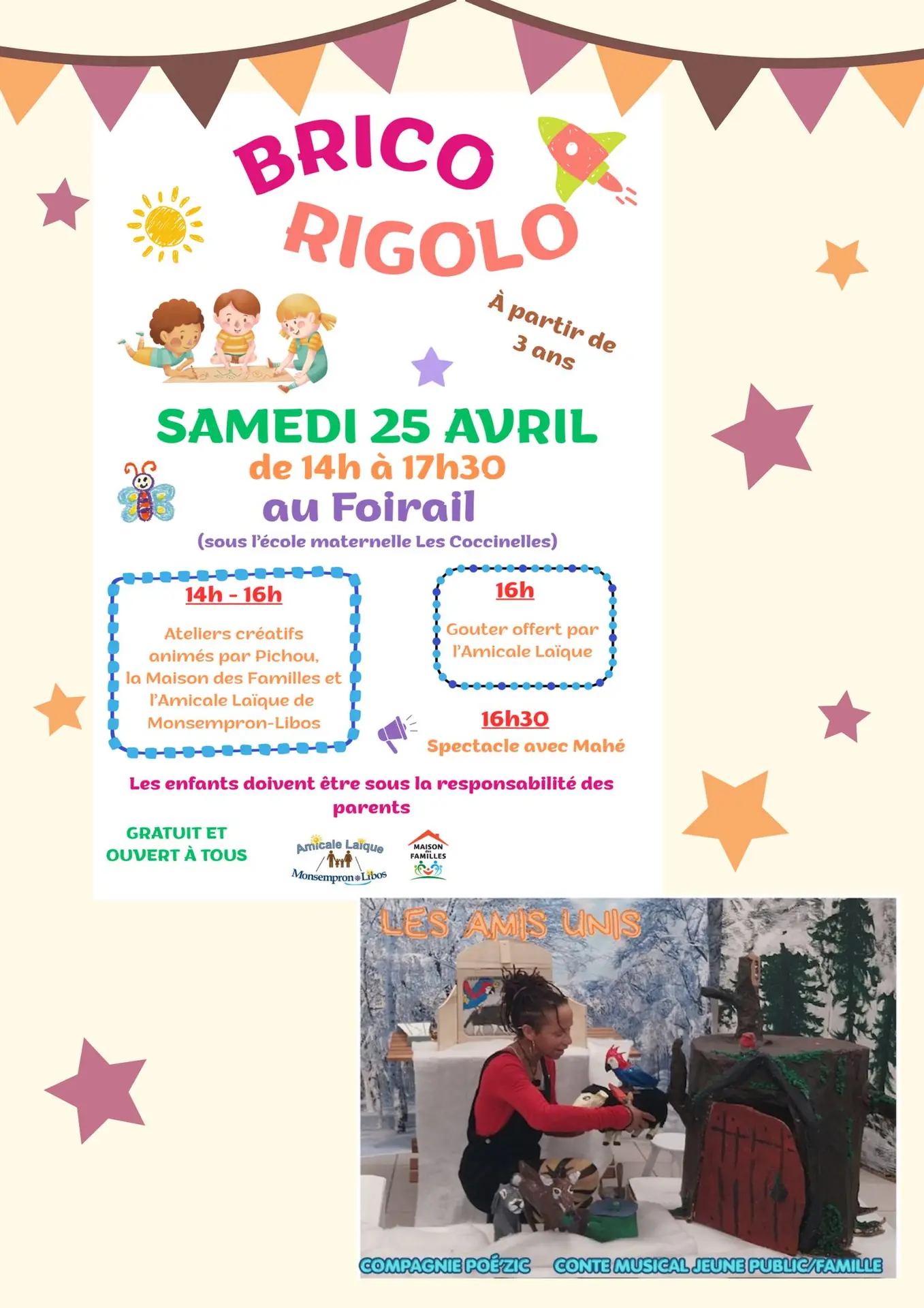 Ateliers créatifs parents et enfants à partir de 3 ans. 16h : Goûter offert par l'Amicale Laïque. 16h30 : Spectacle avec Mahé. Ouvert à tous.