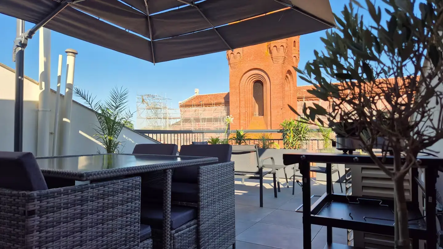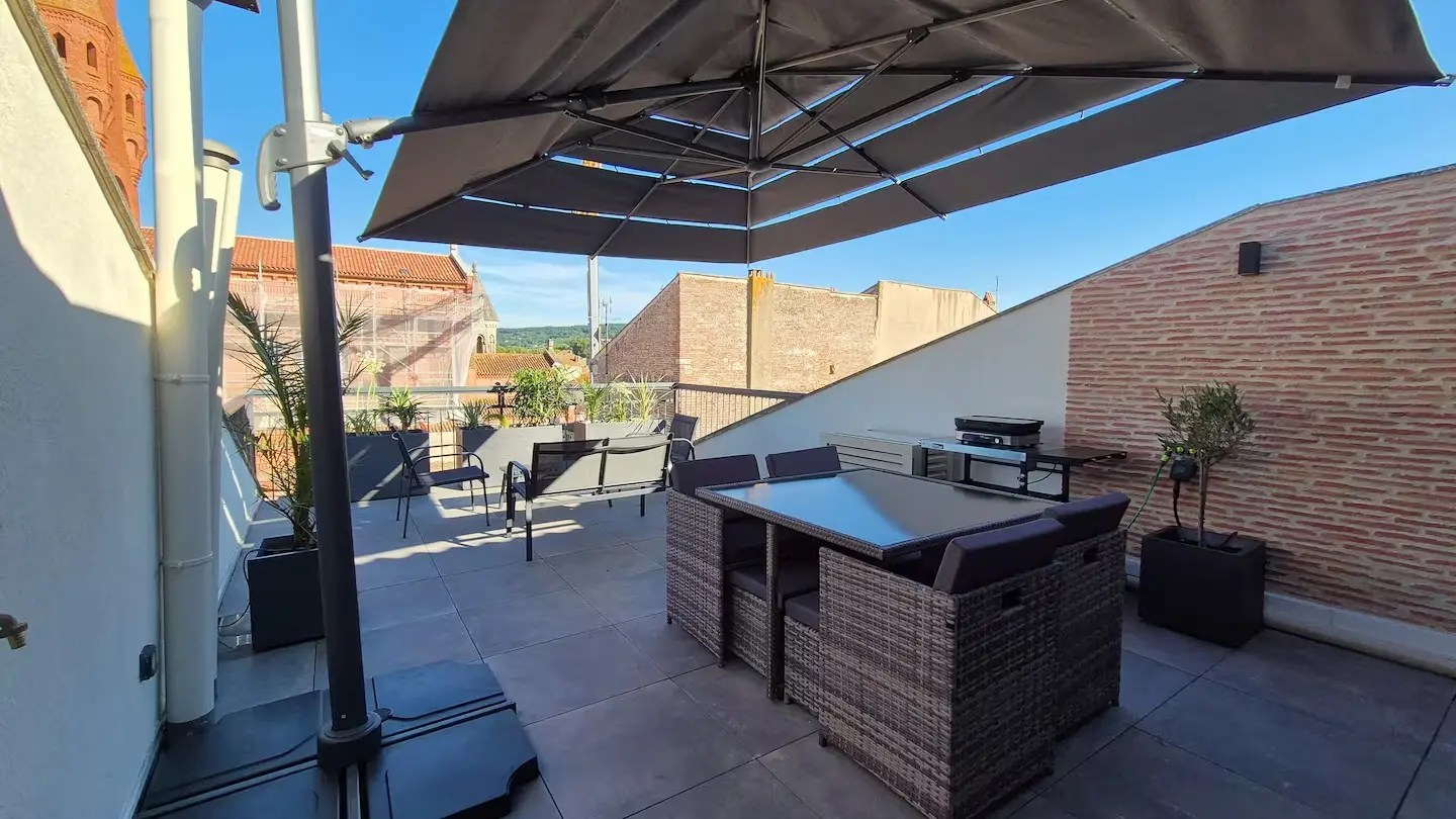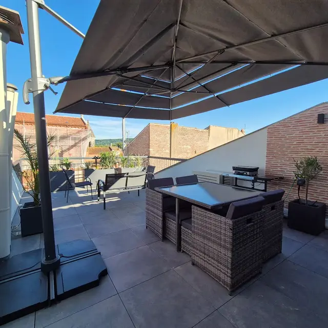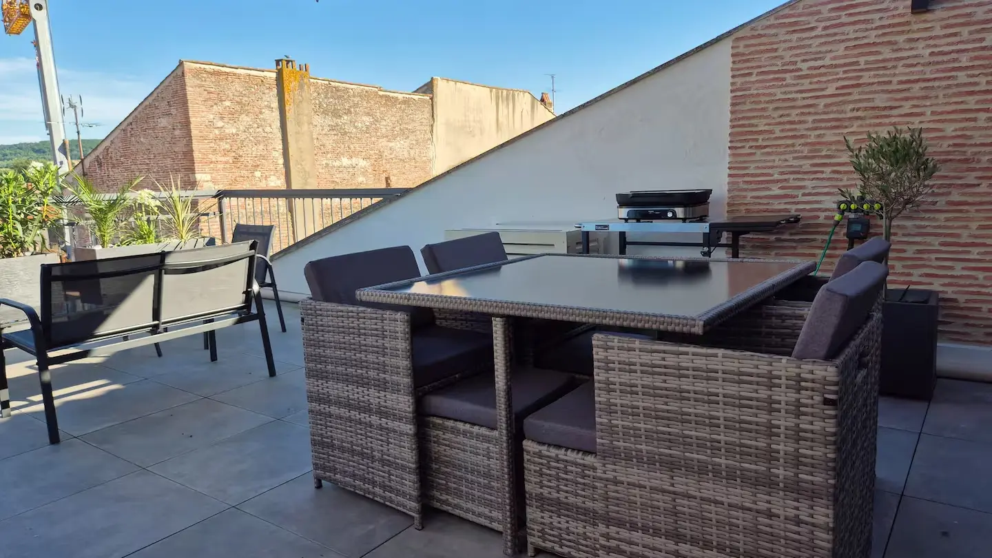 Offrez vous un moment suspendu dans un cadre unique sur une des plus hautes terrasses de la bastide Villeneuvoise. Appartement de charme en plein cœur de Villeneuve-sur-Lot. Offrez vous une parenthèse de confort et d’authenticité dans cet appartement plein de charme, idéalement situé en plein centre historique de Villeneuve-sur-Lot. Niché dans une bâtisse au caractère préservé, ce logement allie le cachet de l’ancien (briquettes apparentes, poutres...) à une décoration moderne et industrielle du plus bel effet. Il est idéal pour découvrir la bastide à pied. Que vous veniez pour une escapade romantique, un séjour en famille ou un voyage pro, vous y trouverez tout le confort nécessaire : climatisation, WiFi, baignoire balnéo... Un extérieur rare en centre-ville! Profitez d’une grande terrasse privée et ombragée, avec une vue exceptionnelle sur les plus beaux monuments de la Bastide.