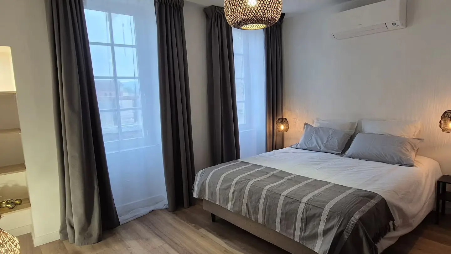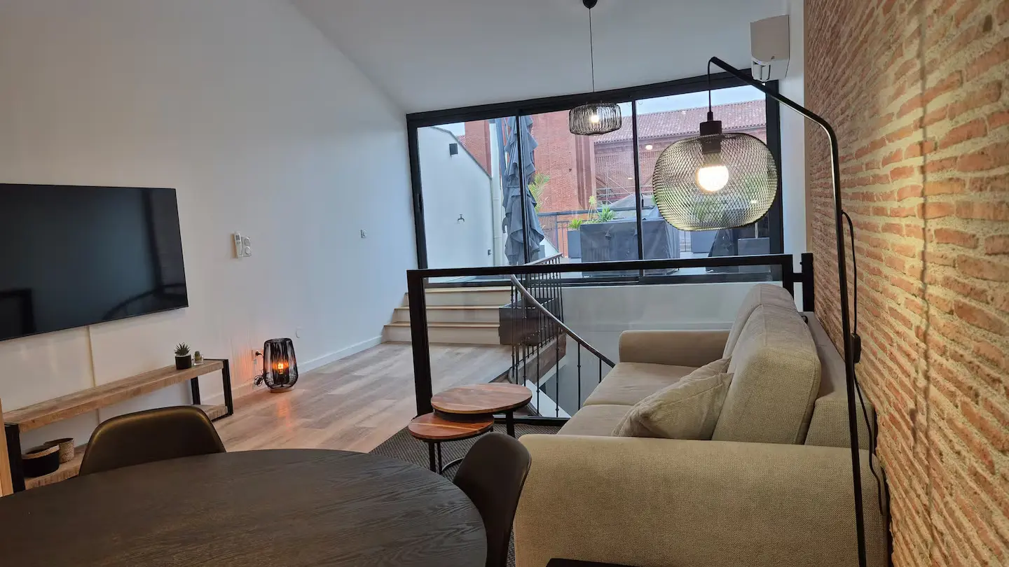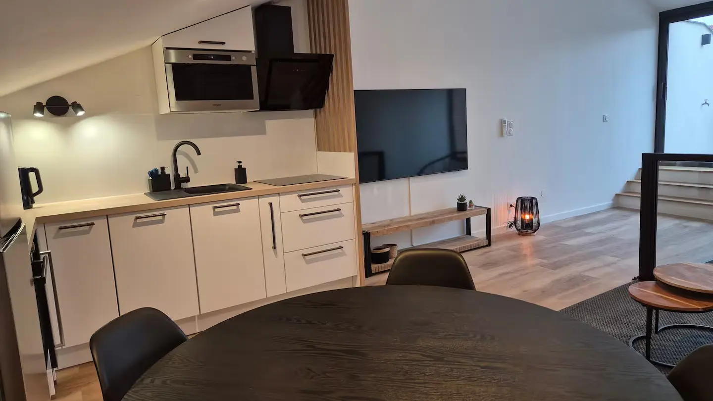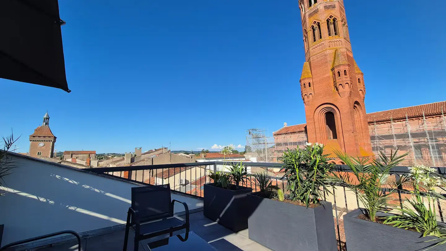 Offrez vous un moment suspendu dans un cadre unique sur une des plus hautes terrasses de la bastide Villeneuvoise. Appartement de charme en plein cœur de Villeneuve-sur-Lot. Offrez vous une parenthèse de confort et d’authenticité dans cet appartement plein de charme, idéalement situé en plein centre historique de Villeneuve-sur-Lot. Niché dans une bâtisse au caractère préservé, ce logement allie le cachet de l’ancien (briquettes apparentes, poutres...) à une décoration moderne et industrielle du plus bel effet. Il est idéal pour découvrir la bastide à pied. Que vous veniez pour une escapade romantique, un séjour en famille ou un voyage pro, vous y trouverez tout le confort nécessaire : climatisation, WiFi, baignoire balnéo... Un extérieur rare en centre-ville! Profitez d’une grande terrasse privée et ombragée, avec une vue exceptionnelle sur les plus beaux monuments de la Bastide.